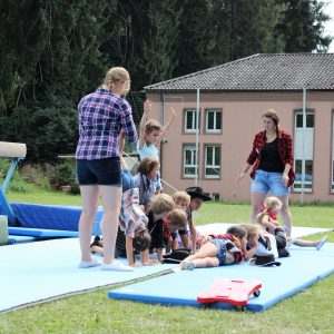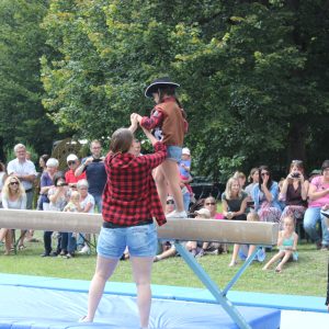 Nach dem Turnier nutzten alle erst einmal den leckeren Mittagstisch mit Krustenbraten und Spätzle. Dann zeigten am Nachmittag ab 15.30 Uhr die einzelnen Gruppen des TVO ihr Können beim Turn- und Showprogramm. Den Anfang machten Selina`s Maxis, die den Platz gleich in ein Schwimmbad verwandelten. Die Dachhäschen um Emilia und Jenny kletterten als Cowboys über den Schwebebalken, während Alex`s Turnjungs Boden und Sprung zeigten. Die Mädchen-Freizeitgruppe brachten die Illusion von Schwimmen und Tauchen auf den Rasen. Die Jungs von Jochen und Florian flogen auf dem Trampolin durch die Lüfte, bevor die Turnerinnen an Balken und Boden Ausschnitte aus ihren Wettkämpfen vorführten.